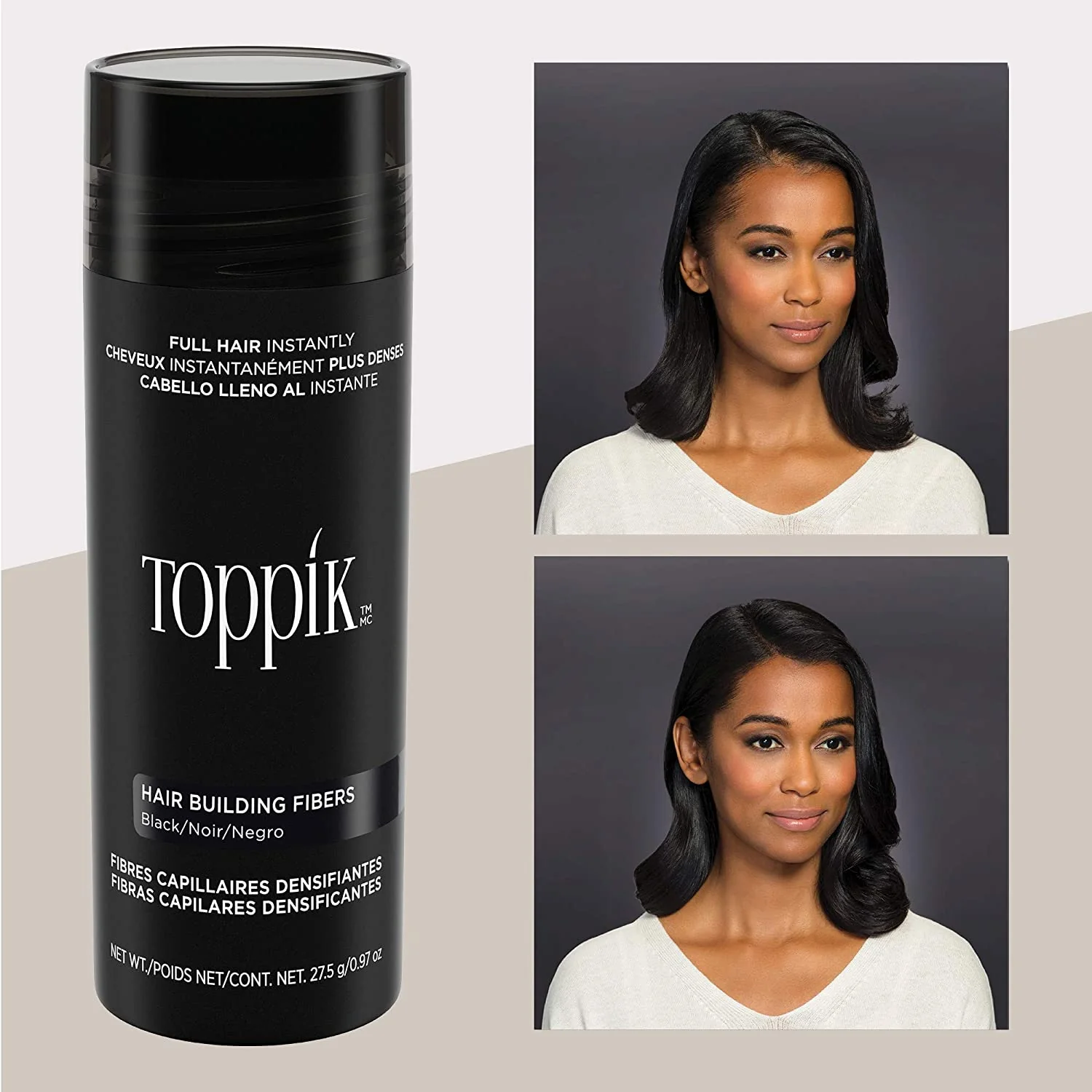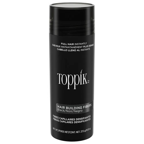 Las fibras capilares de TOPPIK en tono negro están formuladas con queratina de origen natural para aportar densidad inmediata al cabello. Su adherencia electrostática permite cubrir zonas con poca densidad, disimular entradas y crear un aspecto más lleno y uniforme. Su textura ligera se fusiona de forma natural con el cabello existente y ofrece un acabado imperceptible.